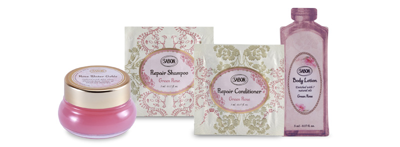 通常版『特別付録②「経年美化beauty」応援BOX【全身ディープ保湿&ケアセット】』にて、SABON「ローズウォータージュレ」(15mL)、「ボディローション」(5mL)、「リペアシャンプー グリーン・ローズ」(5mL)、「リペアコンディショナー グリーン・ローズ」(5mL)をお試しいただけます。
